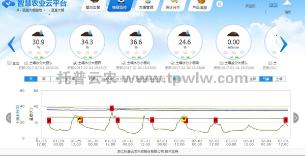 浙江托普云農(nóng)水肥一體化監(jiān)控系統(tǒng)能夠?qū)崟r(shí)監(jiān)測(cè)基地大蔥的種植環(huán)境,實(shí)現(xiàn)智能化、定時(shí)定量的灌溉,其中包括系統(tǒng)云平臺(tái)、視頻監(jiān)控系統(tǒng)、采集終端、施肥機(jī)、過濾系統(tǒng)、閥門控制器、電磁閥、田間管路等。系統(tǒng)所采集的數(shù)據(jù)實(shí)時(shí)上傳到托普智慧農(nóng)業(yè)云平臺(tái),并快速進(jìn)行統(tǒng)計(jì)分析,解決了工作人員對(duì)數(shù)據(jù)的采集分析需求,并確保了數(shù)據(jù)采集的精準(zhǔn)、快速、全面。用戶可通過手機(jī)APP和電腦端遠(yuǎn)程實(shí)時(shí)查看基地現(xiàn)場(chǎng)視頻、水肥流量統(tǒng)計(jì)數(shù)據(jù),也可遠(yuǎn)程手動(dòng)設(shè)置水肥參數(shù),很大程度上提高了灌溉用水效率。