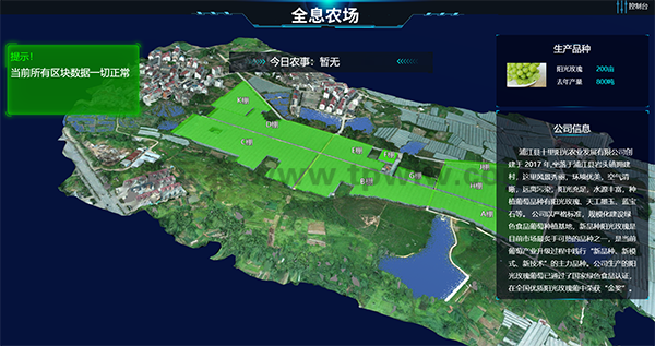 作為智慧農(nóng)業(yè)的升級版本,“超級農(nóng)場”項目對生產(chǎn)經(jīng)營管理等每一個環(huán)節(jié),都進(jìn)行了嚴(yán)格的監(jiān)管,數(shù)據(jù)采集,實時監(jiān)測。通過無人機(jī)的航拍,實現(xiàn)了對整個農(nóng)場的3D建模,把整個農(nóng)場分成A—K,差不多11個區(qū)塊,然后進(jìn)行區(qū)塊的數(shù)字化監(jiān)控。一塊電子顯示屏就可看到農(nóng)場的所有狀況,葡萄園11個鋼架大棚所有環(huán)境信息,包括溫度、濕度、土壤酸堿值、光照等情況都呈現(xiàn)在屏幕上。另外,葡萄園里各處分布了多少攝像頭,有多少在職人員,多少外來人員,也都能一目了然。