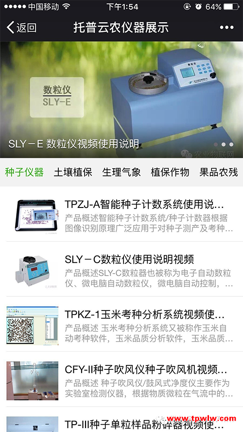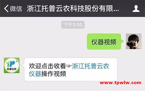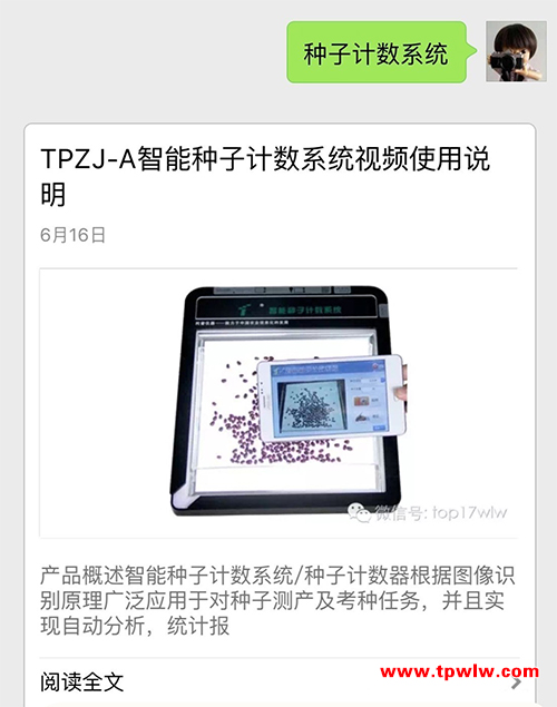 現(xiàn)在只需關(guān)注“浙江托普云農(nóng)科技股份有限公司”的微信公眾號,回復(fù)對應(yīng)的關(guān)鍵字,即可查看儀器操作視頻,比如需要查看智能種子技術(shù)系統(tǒng)的操作視頻,只需要回復(fù)“種子計數(shù)系統(tǒng)”或者儀器型號即可了解如何使用儀器,查看儀器的相關(guān)參數(shù)和功能。