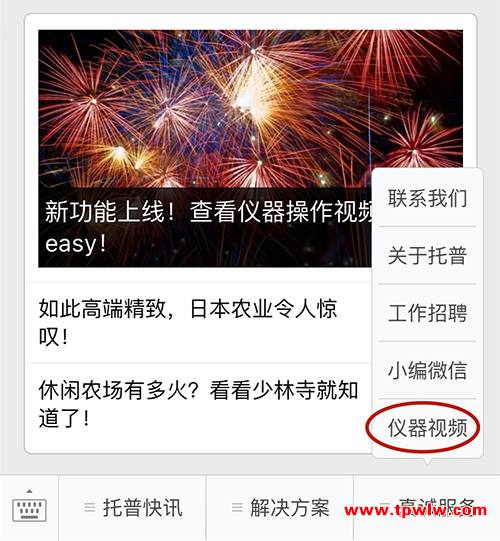 在“浙江托普云農(nóng)科技股份有限公司”微信號的菜單欄也提供了查看視頻的入口,只需要選擇“真誠服務(wù)”→“儀器視頻”即可進(jìn)入頁面查看。