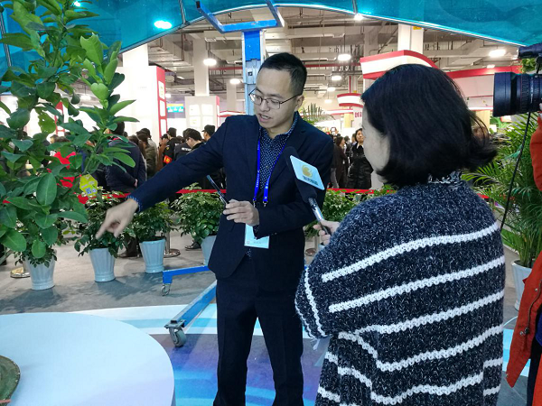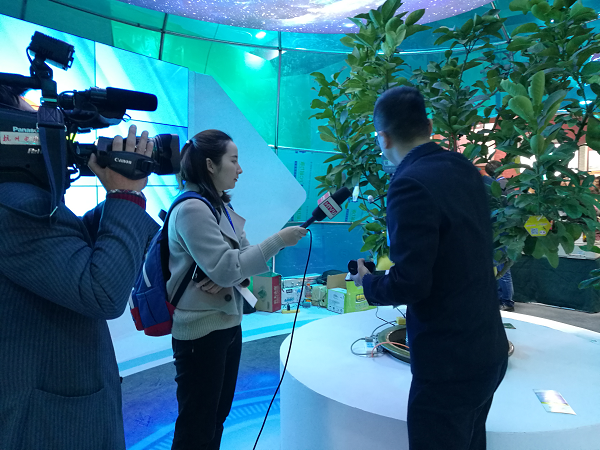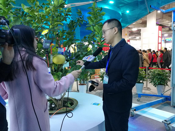 展會現(xiàn)場掛上傳感器的文旦樹“在這棵文旦樹上,我們安裝了無線葉面溫度傳感器、光照強(qiáng)度傳感器、果實膨大傳感器。通過這些傳感器采集傳輸?shù)臄?shù)據(jù),我們就能知道整個樹的生長秘密”。展會現(xiàn)場,現(xiàn)代農(nóng)業(yè)與信息化的互融發(fā)展,吸引浙江衛(wèi)視、杭州電視臺、蕭山日報、舟山電視臺、金華電視臺等記者前來采訪。