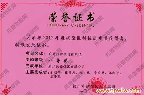 2012年度拱墅區(qū)科學技術進步獎通過企業(yè)申報,有關部門推薦,并經(jīng)專家評審,托普儀器農(nóng)藥殘留快速檢測儀項目最終獲得2012年度拱墅區(qū)科技進步獎一等獎。