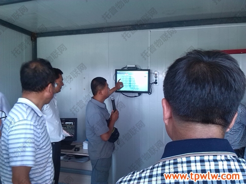 圖為:托普儀器駐新疆辦事處的技術(shù)人員介紹“四情”自動監(jiān)控系統(tǒng)情況