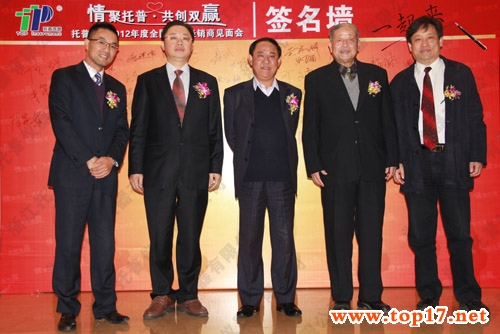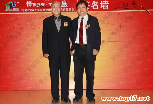 圖為:陳子元院士與高祥照處長(zhǎng)在托普經(jīng)銷(xiāo)商見(jiàn)面會(huì)簽名墻前合影留念